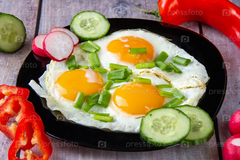 Красивая и аппетитная яичница глазунья из трех яиц в тарелке, украшена овощами