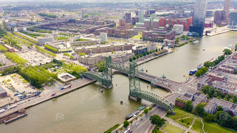 Роттердам, Нидерланды. Роттердамские мосты - Висячий мост Вильямсбург, разводной мост Де Хеф и мост Конингиннебрюг, вид с воздуха