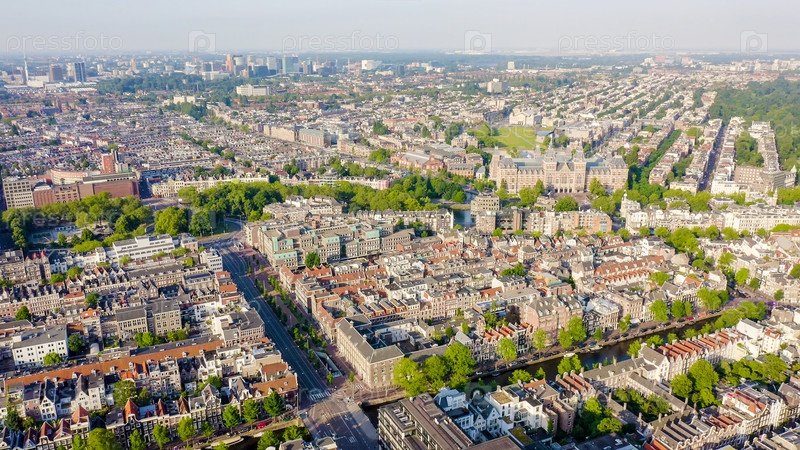 Амстердам, Нидерланды. Музей (Риксмузеум). Здание XIX века. Полет над городскими крышами, вид с воздуха