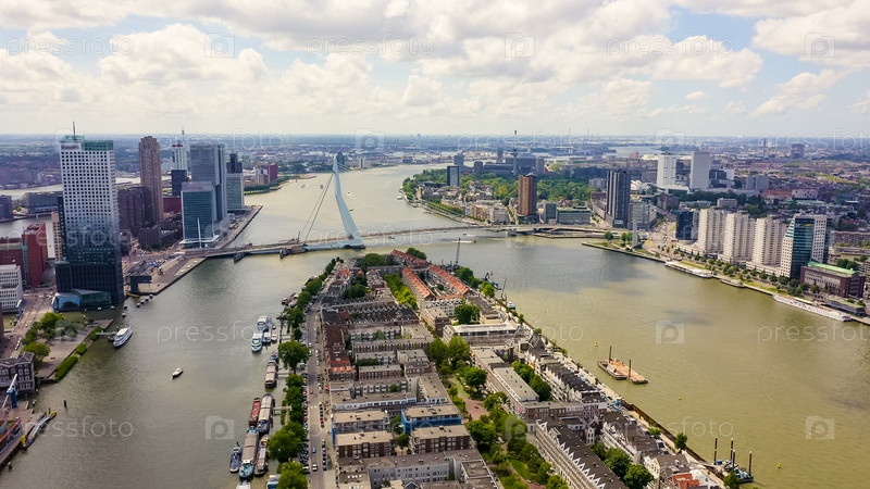 Роттердам, Нидерланды.Остров Нордерайланд (Северный остров) и мост Эразма (Erasmusbrug) через реку Ниве-Маас, вид с воздуха