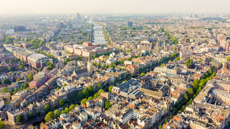 Амстердам, Нидерланды. Летать над крышами города. Историческая часть города с городскими судоходными каналами, вид с воздуха