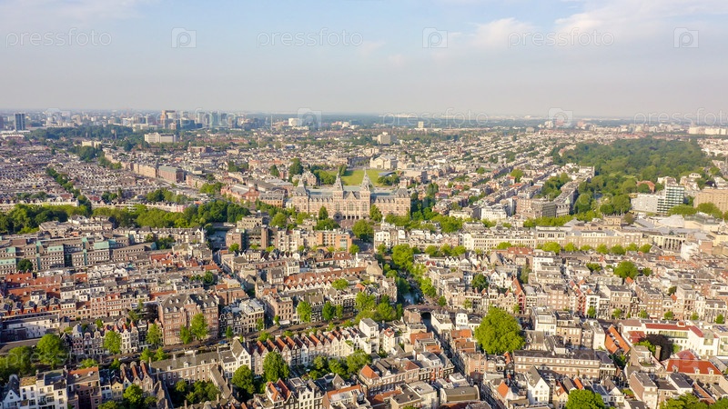 Амстердам, Нидерланды. Музей (Риксмузеум). Здание XIX века. Полет над городскими крышами, вид с воздуха