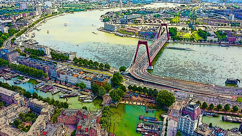 Роттердам, Нидерланды. Висячий мост Вильямсбург через реку Ньиве-Маас. Яркая иллюстрация в мультяшном стиле. С высоты птичьего полета