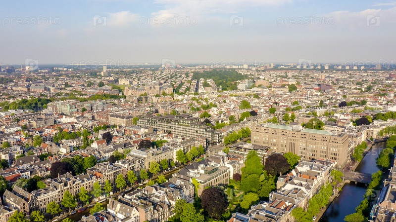 Амстердам, Нидерланды. Музей (Риксмузеум). Здание XIX века. Полет над городскими крышами, вид с воздуха