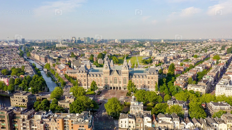 Амстердам, Нидерланды. Музей (Риксмузеум). Здание XIX века. Полет над городскими крышами, вид с воздуха