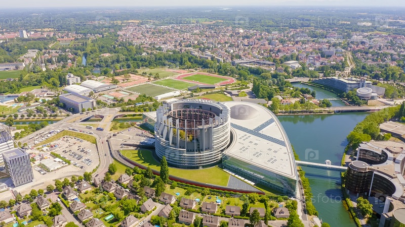 Страсбург, Франция - 5 июля 2019 г.: Комплекс зданий - Европейский парламент, Европейский суд по правам человека, Дворец Европы, вид с воздуха