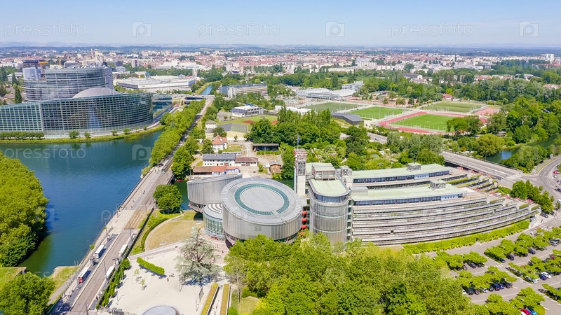 Страсбург, Франция. Комплекс зданий - Европарламент, Европейский суд по правам человека, Дворец Европы, Вид с воздуха