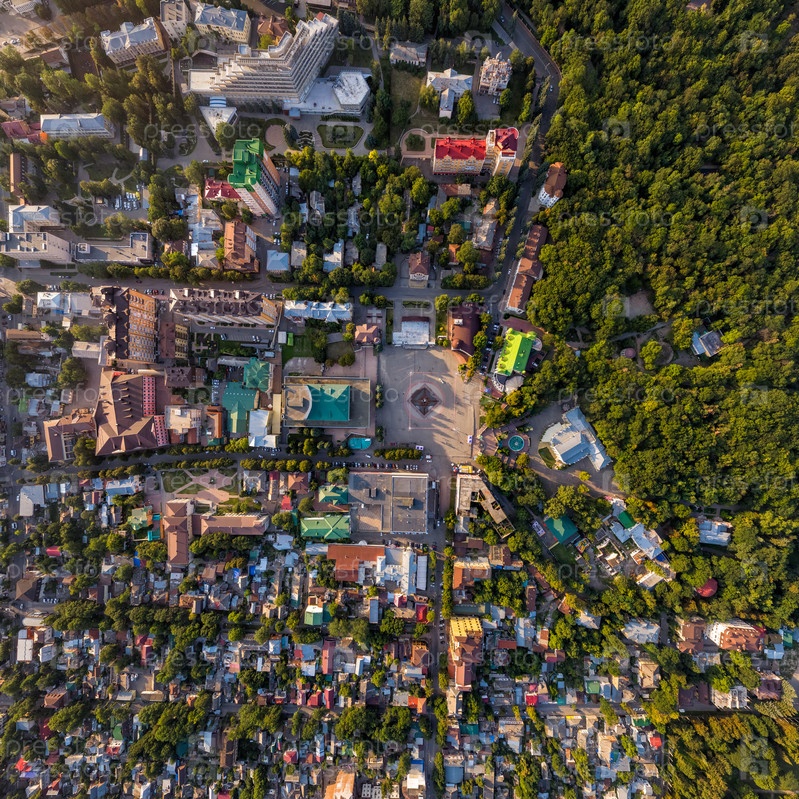 Ессентуки, Россия. Курортный город. Панорамный вид на город на закате. С высоты птичьего полета