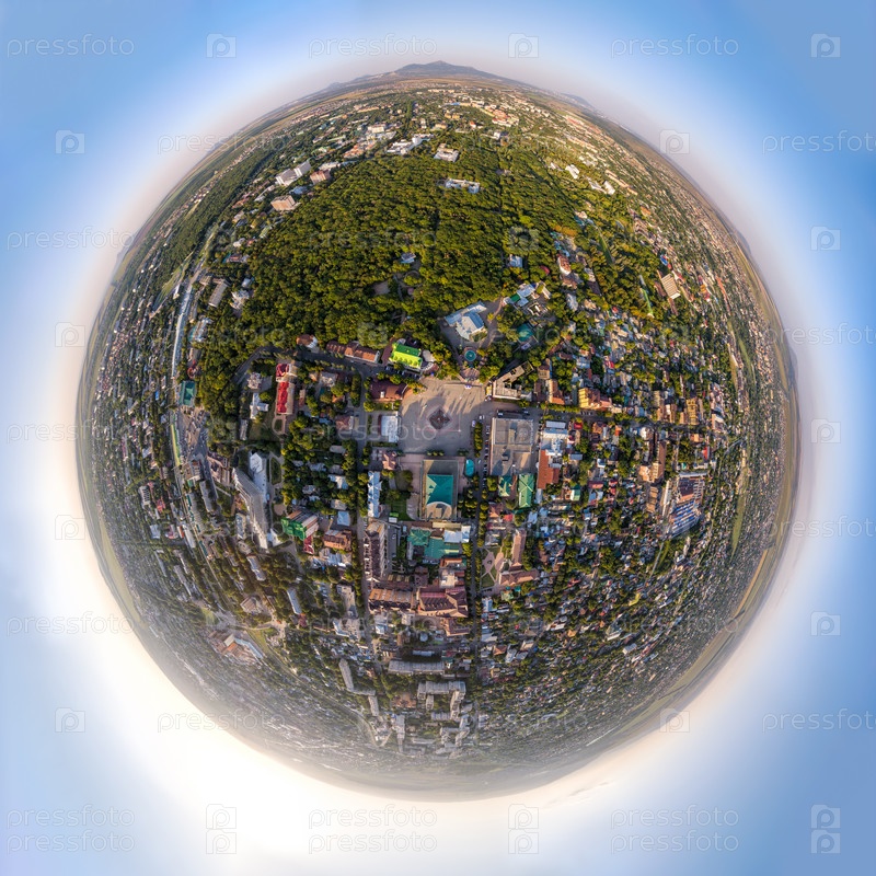 Ессентуки, Россия. Курортный город. Панорамный вид на город на закате. С высоты птичьего полета. 360-градусный панорамный астероид