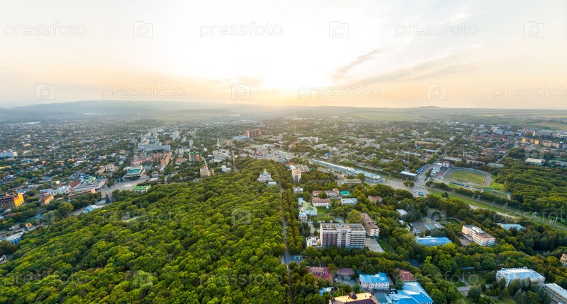 Ессентуки, Россия. Панорама города и Курортного парка. Парк культуры и отдыха. Время заката. С высоты птичьего полета
