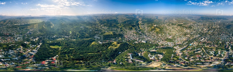 Кисловодск, Россия. Панорама города и гор. Курортный парк. С высоты птичьего полета. Вид на гору Эльбрус. Панорама 360