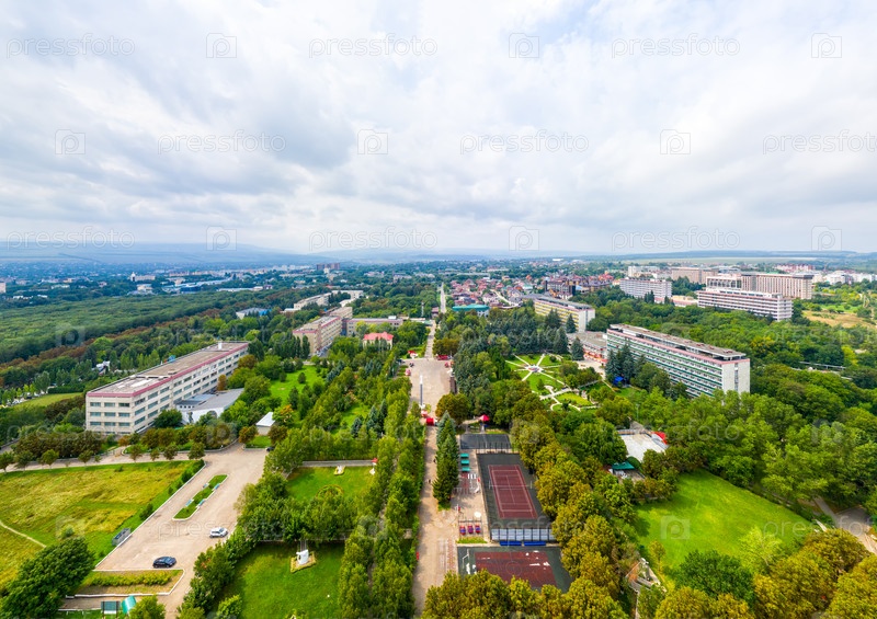 Ессентуки, Россия. Панорама города в пасмурную погоду. С высоты птичьего полета. Лето