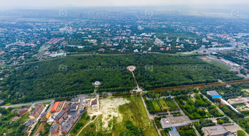 Ессентуки, Россия. Парк Победы. Панорама города в пасмурную погоду. С высоты птичьего полета. Лето