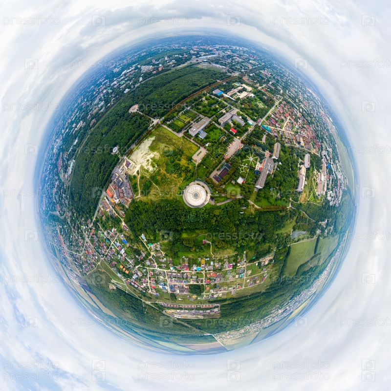 Ессентуки, Россия. Питьевая галерея минеральных источников. С высоты птичьего полета. Лето. 360-градусный панорамный астероид