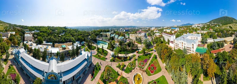 Пятигорск, Россия. Лермонтовская галерея. Парк Цветник. С высоты птичьего полета. Панорама 360. Лето