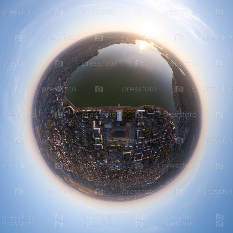Воткинск, Россия. Панорама города. Воткинская плотина, 1758 г. Воткинский пруд и завод. Время заката. С высоты птичьего полета. 360-градусный панорамный астероид