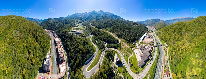 Сочи, Россия. Альпийское шоссе. Деревня Роза Хутор. Деревня Красная Поляна. Долина реки Мзымта. Панорама 360. Вид с воздуха