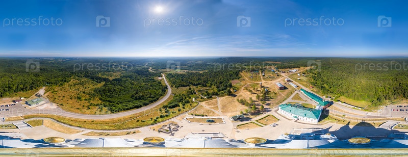 Россия, Пермский край. Белогорский Свято-Николаевский миссионерский монастырь. Крестовоздвиженский собор Белогорского Николаевского монастыря. С высоты птичьего полета. Панорама 360