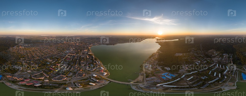 Воткинск, Россия. Панорама города. Воткинская плотина, 1758 г. Воткинский пруд и завод. Время заката. С высоты птичьего полета. Панорама 360