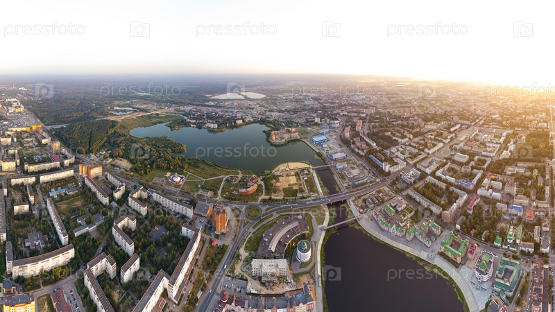 Йошкар-Ола, Россия. Панорама центра города во время заката. С высоты птичьего полета