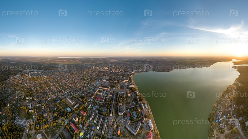 Воткинск, Россия. Панорама города. Воткинская плотина, 1758 г. Воткинский пруд и завод. Время заката. С высоты птичьего полета