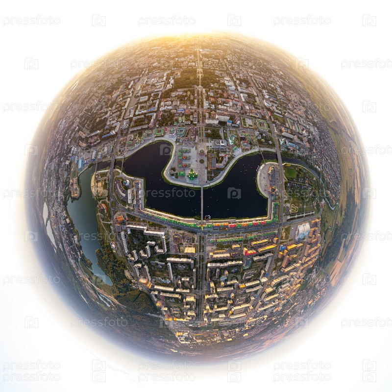 Йошкар-Ола, Россия. Панорама центра города во время заката. С высоты птичьего полета. 360-градусный панорамный астероид