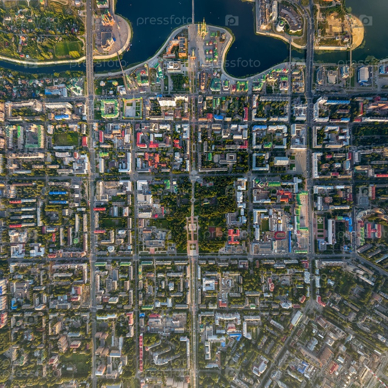 Йошкар-Ола, Россия. Панорама центра города во время заката. С высоты птичьего полета