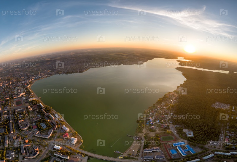 Воткинск, Россия. Панорама города. Воткинская плотина, 1758 г. Воткинский пруд и завод. Время заката. С высоты птичьего полета