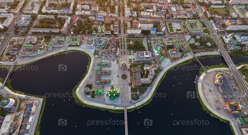 Йошкар-Ола, Россия. Панорама центра города во время заката. С высоты птичьего полета
