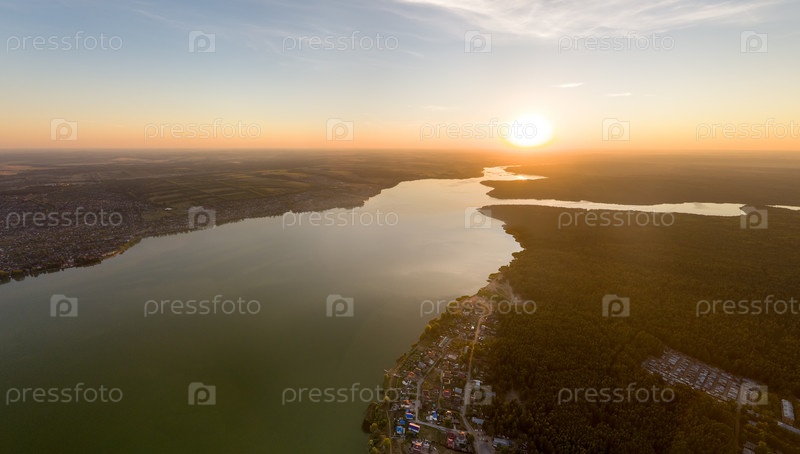 Воткинск, Россия. Городской пруд. Панорама города. Время заката. с высоты птичьего полета