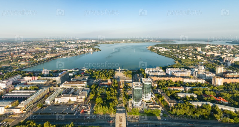 Россия, Ижевск. Центральная площадь. Ижевский пруд. Панорама города с воздуха