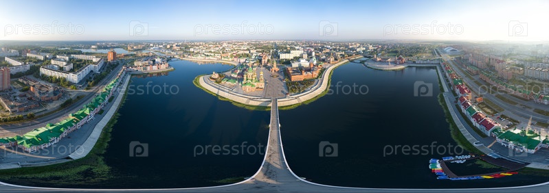 Йошкар-Ола, Россия. Панорама центра города утром. С высоты птичьего полета. Панорама 360