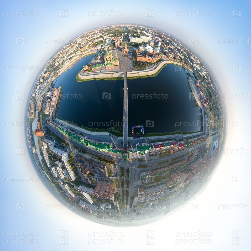 Йошкар-Ола, Россия. Панорама центра города утром. С высоты птичьего полета. 360-градусный панорамный астероид