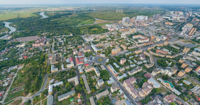 Рязань, Россия. Панорамный вид на город с воздуха. Река Ока. С высоты птичьего полета