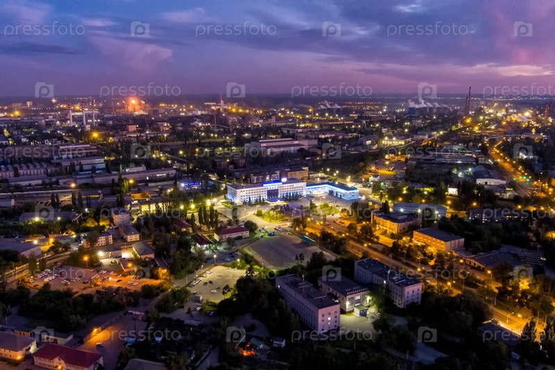 Липецк, Россия. Металлургический завод. Левобережный район. Сияние после захода солнца. Лето. С высоты птичьего полета