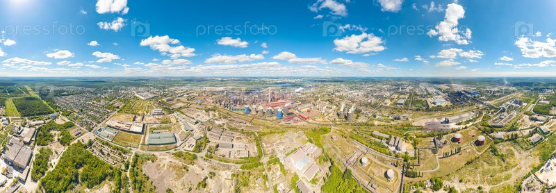 Липецк, Россия. Металлургический завод. Доменные печи. Вид на город летом. Солнечный день. Панорама 360. Вид с воздуха