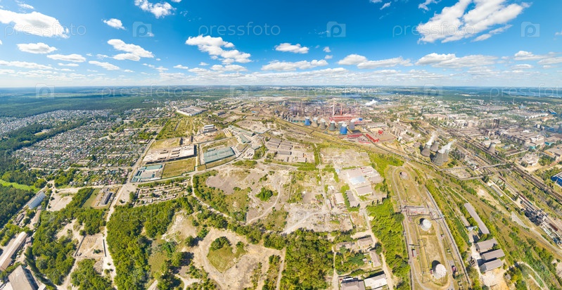 Липецк, Россия. Металлургический завод. Доменные печи. Вид на город летом. Солнечный день. С высоты птичьего полета