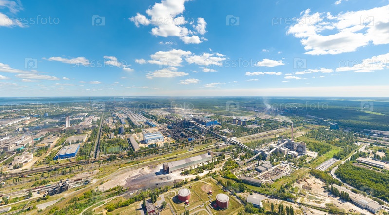 Липецк, Россия. Металлургический завод. Доменные печи. Вид на город летом. Солнечный день. С высоты птичьего полета