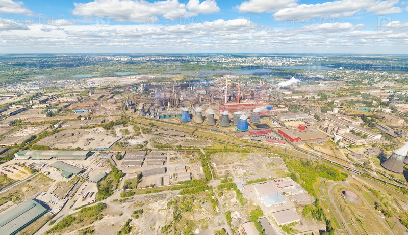 Липецк, Россия. Металлургический завод. Доменные печи. Вид на город летом. Солнечный день. С высоты птичьего полета