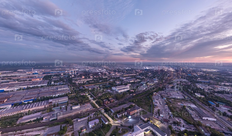 Липецк, Россия. Металлургический завод. Левобережный район. Сияние после захода солнца. Лето. С высоты птичьего полета