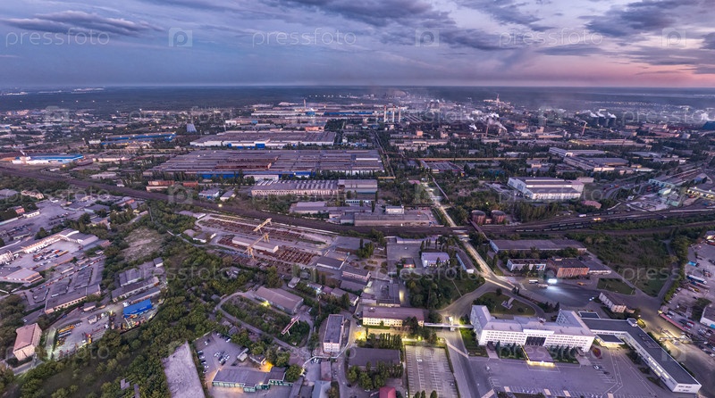 Липецк, Россия. Металлургический завод. Левобережный район. Сияние после захода солнца. Лето. С высоты птичьего полета