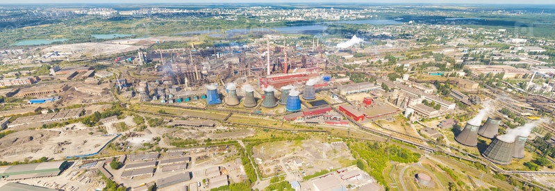 Липецк, Россия. Металлургический завод. Доменные печи. Вид на город летом. Солнечный день. С высоты птичьего полета