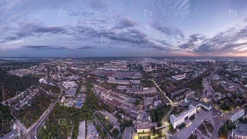Липецк, Россия. Металлургический завод. Левобережный район. Сияние после захода солнца. Лето. С высоты птичьего полета