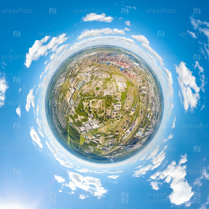 Липецк, Россия. Металлургический завод. Индустриальная зона. Вид на город летом. Солнечный день. 360-градусный панорамный астероид