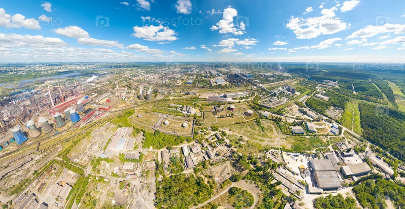Липецк, Россия. Металлургический завод. Доменные печи. Вид на город летом. Солнечный день. С высоты птичьего полета
