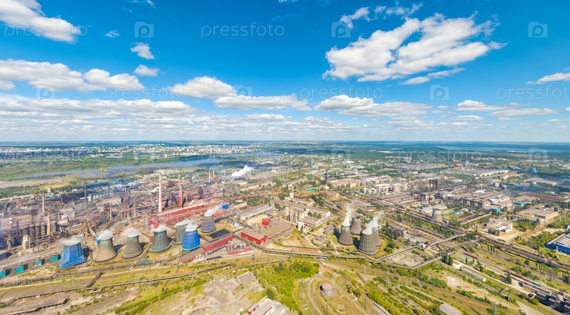 Липецк, Россия. Металлургический завод. Доменные печи. Вид на город летом. Солнечный день. С высоты птичьего полета