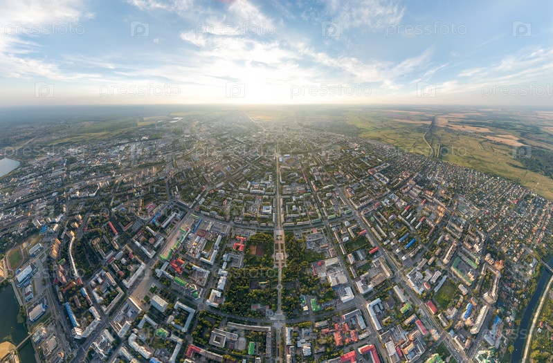 Йошкар-Ола, Россия. Панорама центра города во время заката. С высоты птичьего полета