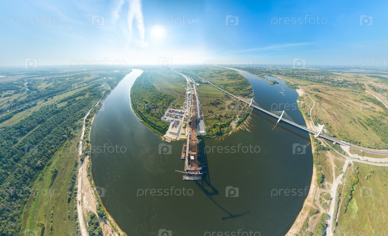Муром, Россия. Муромский мост. Строительство моста через реку Оку. Строительная площадка трассы М12 Москва - Казань. С высоты птичьего полета