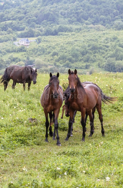 Две коричневые лошади смотрят в камеру. Лошади пасутся в горах среди зеленой травы. Концепция разведения крупного рогатого скота