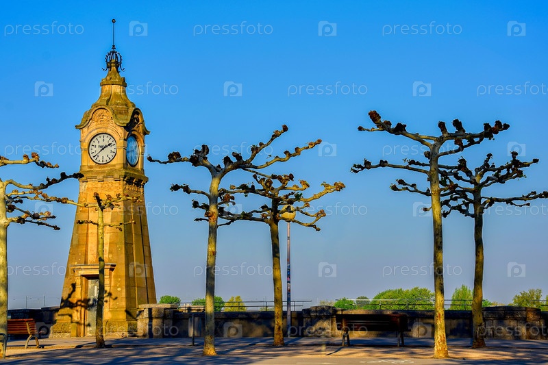 Набережная Рейна с часами и деревьями